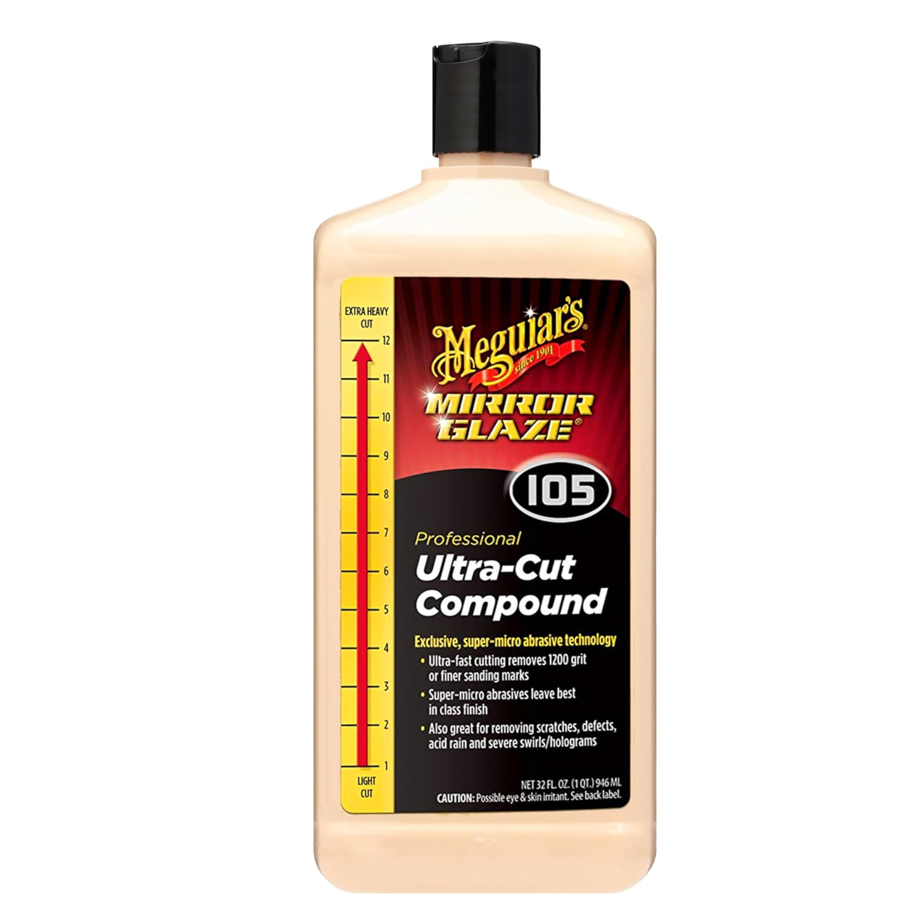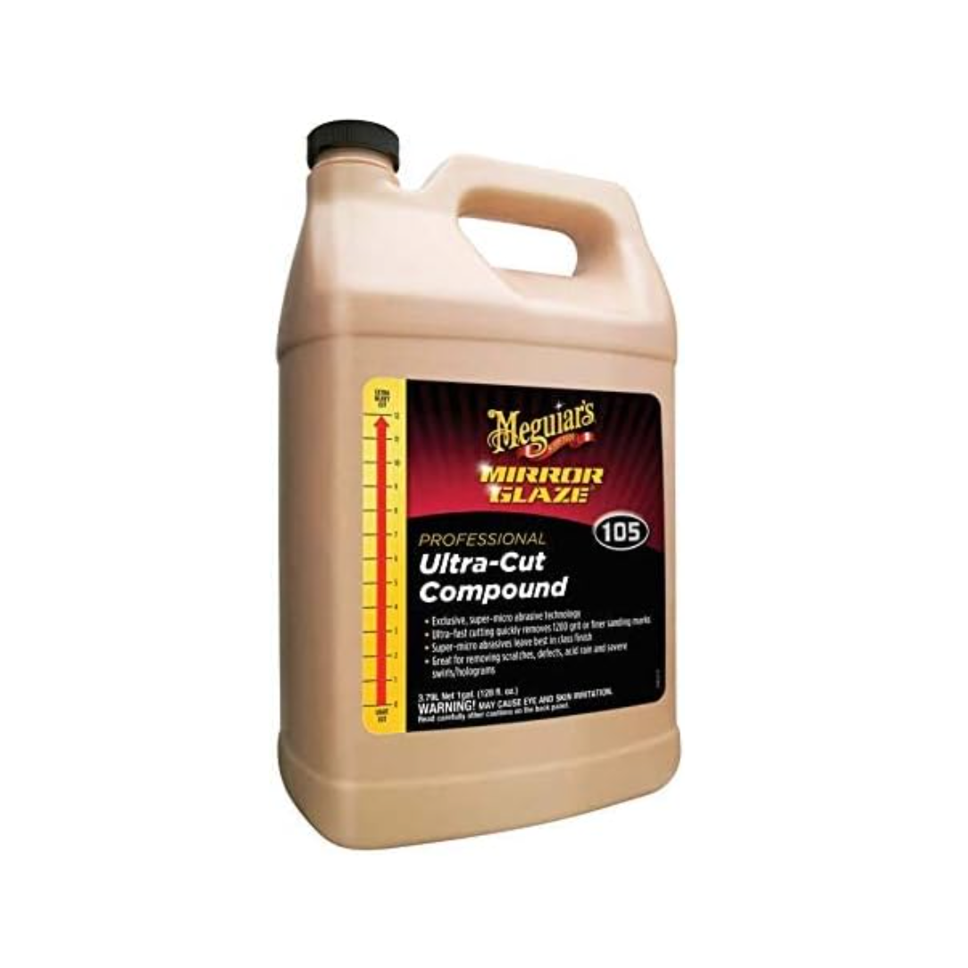 Use Meguiar’s M105 Mirror Glaze Ultra-Cut Compound to remove scratches, severe swirls/holograms, acid rain and other defects from your paint finish and leave it with a best-in-class mirror-like gloss. Our exclusive super micro-abrasive technology features ultra-fast cutting ability to remove 1200 grit or finer sanding marks. This professional grade formula is safe and effective on all glossy paint finishes, including clear coats.